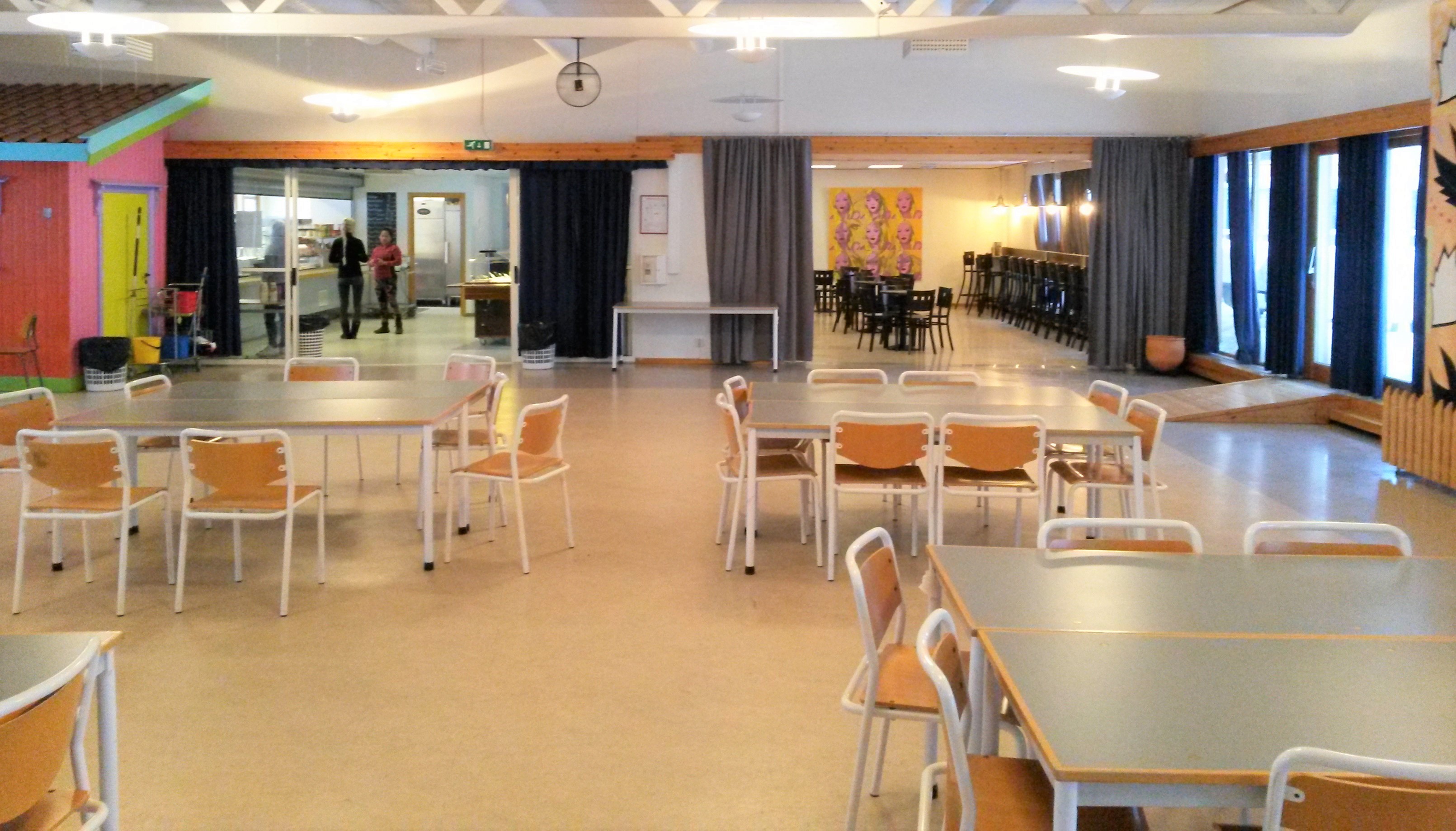 Du trenger ikke kjøpe varer for å bruke kantina vår, du er hjertelig velkommen til å spise medbrakt niste, snakke med folk eller sitte å jobbe. Ved vanlige skoledager er aulaen rigget med flere store gruppebord med plass til 6-10 personer.